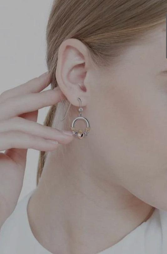 14k Rose Gold & Gold s925 Silver Tri Tone Irish Claddagh Dangle Earrings