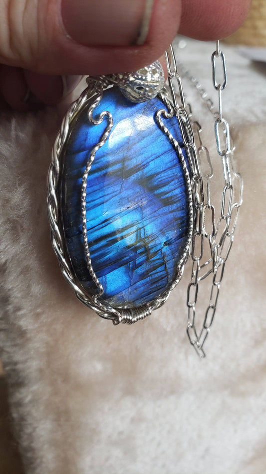 89ct Exceptional Deep BLUE Fire Finland Labradorite Ui’Cathain™ Dynasty Bloodline Gemstone Collection 963hz -Necklace-Handmade UNtreated w 26inch Silvery Paperclip Chain